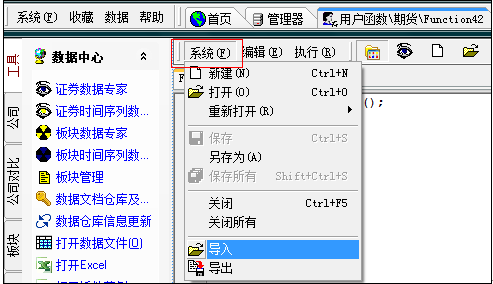 打开该函数,单击“系统”(注意,此处的系统是代码编辑窗口上的“系统”)下的“导入”。如下图所示。