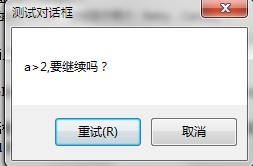弹出如下消息对话框,选择“重试”则返回“重试”按钮id的返回字,选择“取消”则返回“取消”按钮id的返回字。