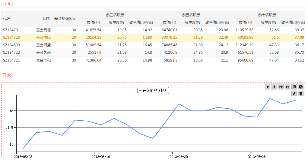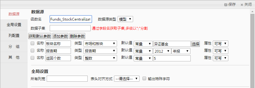 选中当前表格内容区,则出现工具栏,点击其中的编辑按钮,弹出元素配置栏,先以“表格”展示持股集中度,输入模型名,自动获取参数。