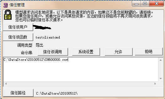 我们可以信任某个用户来源的所有的函数的调用,也可以信任该来源函数的调用,还可以仅仅信任该调用(例如信任导出的调用必须导出的文件名都是一致的),我们还可以临时允许该调用或者拒绝该调用。这样下次当调用发生的时候,该信任管理窗口依旧会出现。