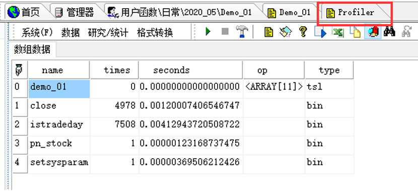 //结果:times为函数运行的次数,seconds为运行时间,op为指令的优化信息,type为函数类型。