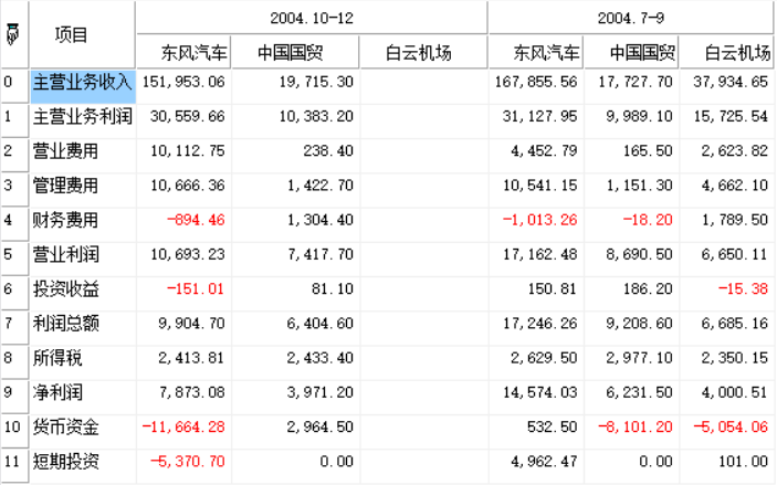 t:=array(("代码":"SH600006","名称":"东风汽车","2004.10-12@主营业务收入":151953.06,"2004.10-12@主营业务利润":30559.66,"2004.10-12@营业费用":10112.75,"2004.10-12@管理费用":10666.36,"2004.10-12@财务费用":-894.46,"2004.10-12@营业利润":10693.23,"2004.10-12@投资收益":-151.01,"2004.10-12@利润总额":9904.7,"2004.10-12@所得税":2413.81,"2004.10-12@净利润":7873.08,"2004.10-12@货币资金":-11664.28,"2004.10-12@短期投资":-5370.7,"2004.7-9@主营业务收入":167855.56,"2004.7-9@主营业务利润":31127.95,"2004.7-9@营业费用":4452.79,"2004.7-9@管理费用":10541.15,"2004.7-9@财务费用":-1013.26,"2004.7-9@营业利润":17162.48,"2004.7-9@投资收益":150.81,"2004.7-9@利润总额":17246.26,"2004.7-9@所得税":2629.5,"2004.7-9@净利润":14574.03,"2004.7-9@货币资金":532.5,"2004.7-9@短期投资":4962.47),("代码":"SH600007","名称":"中国国贸","2004.10-12@主营业务收入":19715.3,"2004.10-12@主营业务利润":10383.2,"2004.10-12@营业费用":238.4,"2004.10-12@管理费用":1422.7,"2004.10-12@财务费用":1304.4,"2004.10-12@营业利润":7417.7,"2004.10-12@投资收益":81.1,"2004.10-12@利润总额":6404.6,"2004.10-12@所得税":2433.4,"2004.10-12@净利润":3971.2,"2004.10-12@货币资金":2964.5,"2004.10-12@短期投资":0.00,"2004.7-9@主营业务收入":17727.7,"2004.7-9@主营业务利润":9989.1,"2004.7-9@营业费用":165.5,"2004.7-9@管理费用":1151.3,"2004.7-9@财务费用":-18.2,"2004.7-9@营业利润":8690.5,"2004.7-9@投资收益":186.2,"2004.7-9@利润总额":9208.6,"2004.7-9@所得税":2977.1,"2004.7-9@净利润":6231.5,"2004.7-9@货币资金":-8101.2,"2004.7-9@短期投资":0.00),("代码":"SH600004","名称":"白云机场","2004.7-9@主营业务收入":37934.65,"2004.7-9@主营业务利润":15725.54,"2004.7-9@营业费用":2623.82,"2004.7-9@管理费用":4662.1,"2004.7-9@财务费用":1789.5,"2004.7-9@营业利润":6650.11,"2004.7-9@投资收益":-15.38,"2004.7-9@利润总额":6685.16,"2004.7-9@所得税":2350.15,"2004.7-9@净利润":4000.51,"2004.7-9@货币资金":-5054.06,"2004.7-9@短期投资":101.00));