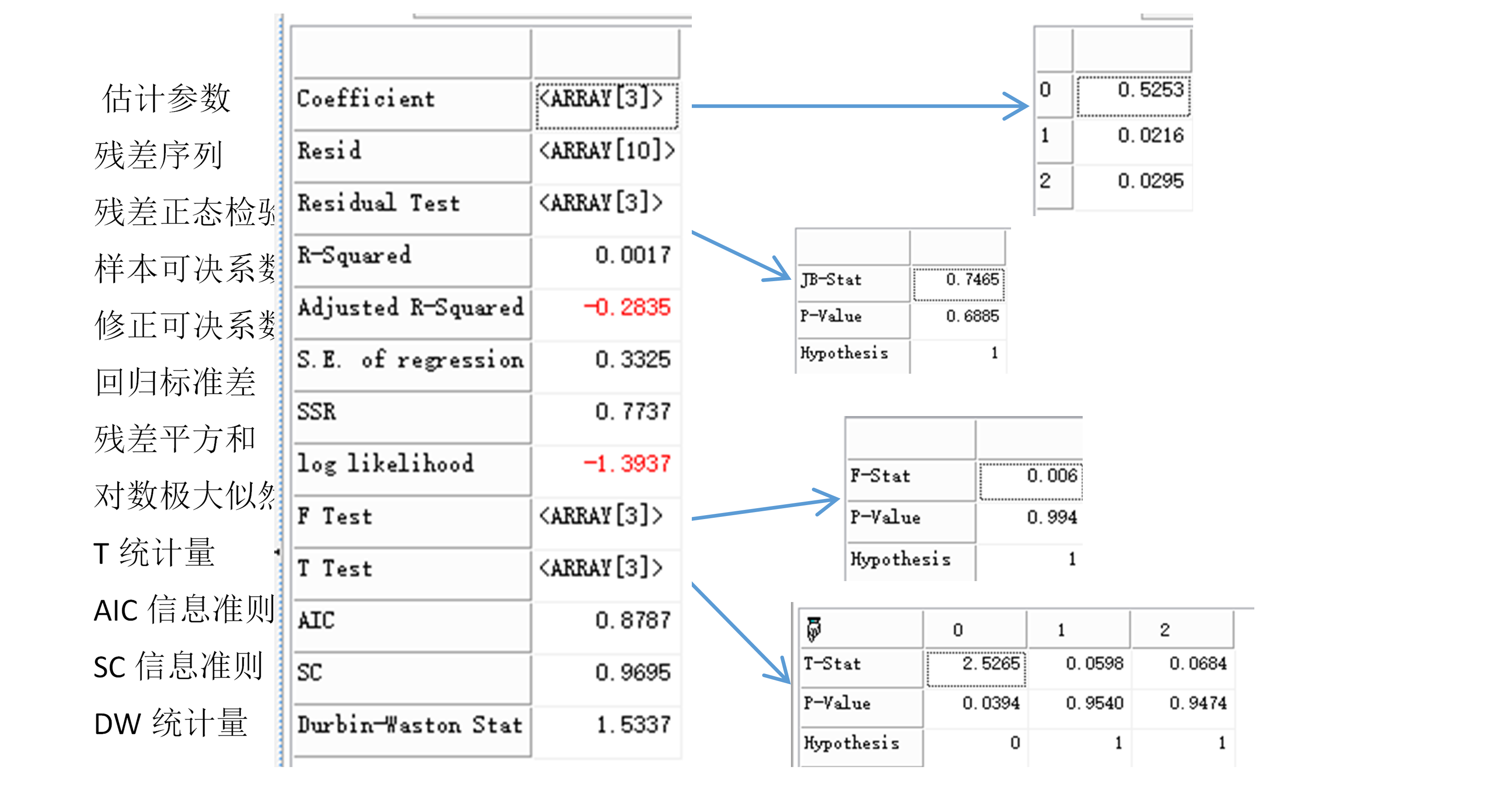 | 返回 | Array,TableArray | 数据表类型 ret["Coefficient"] : ,回归系数,一维数组,如果有常数项,则放在第一项 ret["Resid"] :残差序列,一维数组 ret["Residual Test"] : 残差序列的正态性JB检验,带行标的数组,最后一个元素为1表示服从正态分布 ret["R-Squared"] : 回归的可决系数,实数 ret["Adjusted R-Squared"] :回归的修正可决系数,实数 ret["S.E. of regression"] : 回归的标准差估计,实数 ret["SSR"] : 回归的残差平方和,实数 ret["log likelihood"] : 回归的对数极大似然值,实数 ret["F Test"] : F检验,是用来检验模型的显著性,带行标的数组,最后一个元素为0表示模型显著 ret["T Test"] : T检验,是用来检验变量的显著性,带行标的数组,最后一个元素为0表示该列对应的变量显著 ret["AIC"] : AIC信息准则,实数 ret["SC"] : SC信息准则,实数 ret["Durbin-Waston Stat"] : 结果信息,整数 |