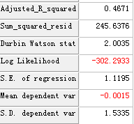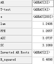 Ret["T-test"]:AR模型参数的T检验 Ret["e"]:残差信息 Ret["LossFunction"]:残差平方和/n-p Ret["FPE"]:预测最大误差 Ret["AIC"]:模型的AIC信息准则 Ret["SC"]:模型的SC信息准则 Ret["Inverted AR Roots"]:特征方程的特征根 Ret["R_squared"]:AR模型的可决系数 Ret["Adjusted_R_squared "]:AR模型的修正可决系数 Ret["Sum_squared_resid"]:AR模型的离差平方和 Ret["Durbin Watson stat"]:DW统计量 Ret["Log Likelihood"]:对数极大似然值 Ret["S.E. of regression"]:回归标准差 |