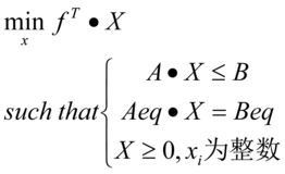 | Aeq | Array of Real | 二维实数数组,表示整数规划模型带“=”约束方程系数矩阵; |