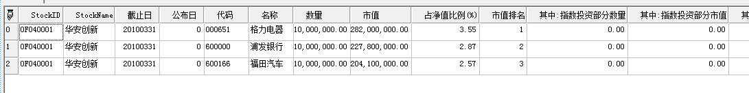 //获得华安创新2010年一季报前3名股票明细