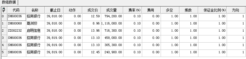 ("代码":"SH600036","名称":"招商银行","截止日":39818.00,"动作":0.00,"成交价":12.59,"成交量":794200.00,"费率(%)":0.1,"费用":0.00,"多空":1.00,"乘数":1.00,"保证金比例(%)":1.00),