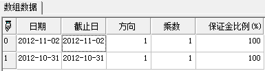 tPercent:=array(('日期':41215,'截止日':nil,'方向':1,'乘数':nil,'保证金比例(%)':nil),('日期':41213,'截止日':nil,'方向':nil,'乘数':nil,'保证金比例(%)':nil));