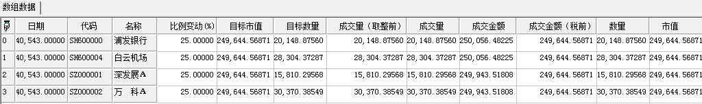 ("日期":40543.00,"代码":"SZ000001","名称":"深发展A","方向":1.00,"调仓前比例(%)":0.00,"调仓后比例(%)":25.00,"调仓前数量":0.00,"成交价":15.79,"开仓费率(%)":0.11975,"平仓费率(%)":0.01975,"乘数":1.00,"保证金比例(%)":100.00),