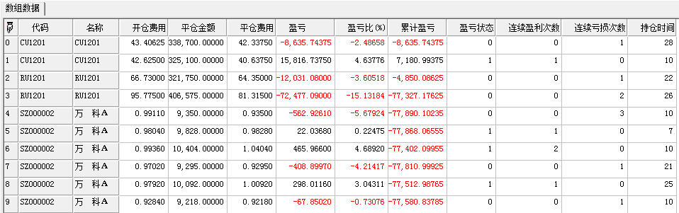 ("代码":"SZ000002","名称":"万科A","乘数":1.00,"方向":1.00,"开仓日期":40714.00,"开仓价":8.16,"开仓数量":1200.00,"开仓费率(%)":0.01,"平仓日期":40746.00,"平仓价":8.41,"平仓数量":1200.00,"平仓费率(%)":0.01),
