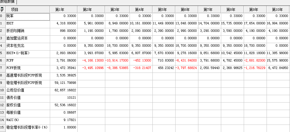 ("项目":"EBIT","第1年":4318.00,"第2年":5961.00,"第3年":8949.00,"第4年":10161.00,"第5年":11449.00,"第6年":13848.00,"第7年":14704.00,"第8年":15735.00,"第9年":17654.00,"第10年":16994.00,"第11年":16986.00,"第12年":16977.00),