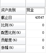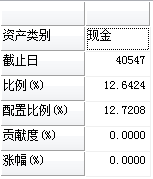 ("资产类别":"现金","截止日":40547,"比例(%)":12.6424158350493,"配置比例(%)":12.7207604508023,"贡献度(%)":0.00,"涨幅(%)":0.00),