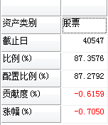 ("资产类别":"股票","截止日":40547,"比例(%)":87.3575841649507,"配置比例(%)":87.2792395491977,"贡献度(%)":-0.615879972038692,"涨幅(%)":-0.705010306690456));