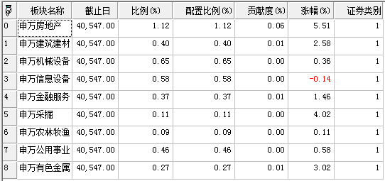 ("代码":"SZ000031","名称":"中粮地产","板块名称":"申万房地产","截止日":40547.00,"市值(万)":1129942.03184238,"涨幅(%)":3.69181409902615,"比例(%)":0.0848856241735902,"贡献度(%)":0.00313381944128695,"配置比例(%)":0.0848856241735902),