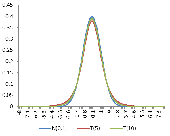 的T分布.T分布曲线和标准正态分布曲线非常接近,它关于纵坐标对称.T分布的最大值比标准正态分布的略小,而尾部更厚.