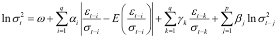 等式左边是条件方差的对数,这意味着杠杆效应影响是指数而不是二次的,所以方差的预测一定是非负,在估计时对系数无需增加非负的限制,只要