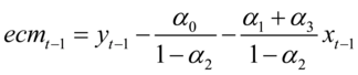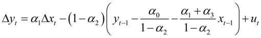 误差修正模型是时间序列间协整关系的主要表现形式,准确的刻画了序列间的长期均衡关系和短期波动特征。设一阶自回归分布滞后模型为: