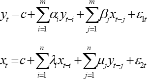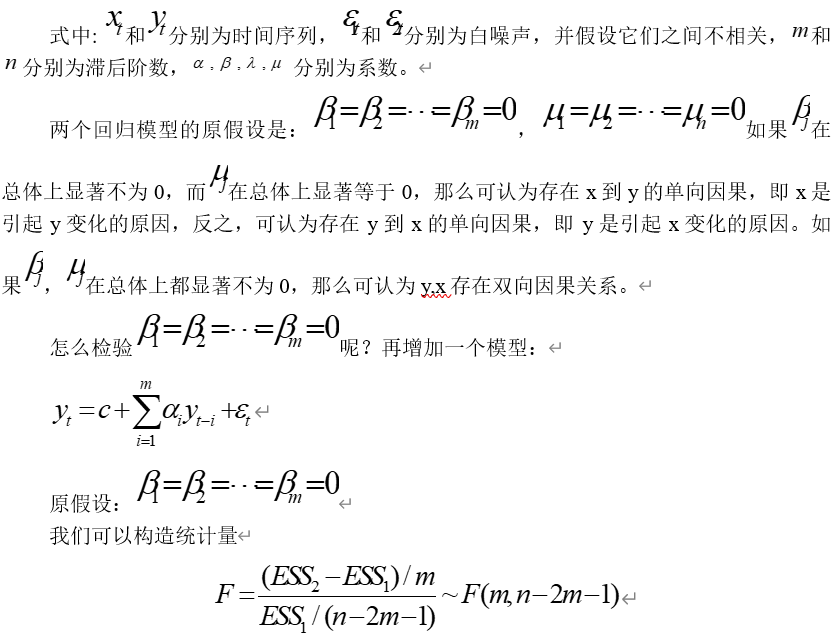Granger因果关系检验是研究两个变量是否存在因果关系的常用方法。因果性检验假定了有关x和y每一变量预测的信息全部包含在这些变量的时间序列中,检验构造的回归模型为:
