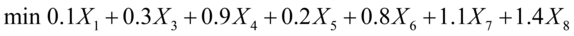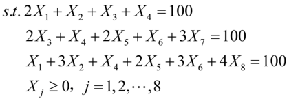 为按第j种方法裁取钢管的跟数,则对各种可能的裁取方法所产生的残料: