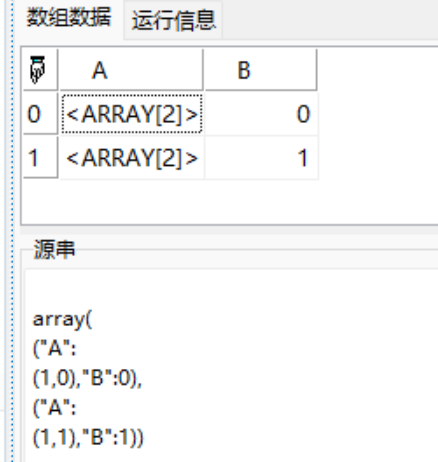 ("A":(31,32),"B":23)); t2:=array(); t:.=ifnumber(mcell); return t; | t:=array(("A":(30,"tsl"),"B":"Tinysoft"), ("A":(31,32),"B":23)); t2:=array(); t::=ifnumber(mcell); return t; |