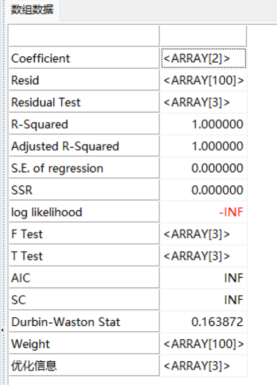 "Coefficient", 回归系数 "Weight" 权重向量 "优化信息" 优化信息 //以下为回归检验指标,当Options中'ifregtest'为真时返回,否则不返回 "Resid", 残差 "Residual Test", 残差正态性检验 "R-Squared", 拟合优度 "Adjusted R-Squared" 调整拟合优度 "S.E. of regression", 回归标准差 "SSR", 拟合误差(残差平方和) "log likelihood", 对数极大似然值 "F Test" F检验(不含常数项的回归不输出F检验) "T Test", T检验 "AIC", AIC信息准则 "SC", SC信息准则 "Durbin-Waston Stat" 检验一阶自相关的DW统计量 |