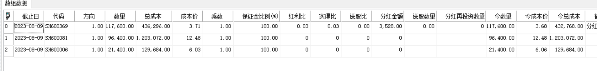 ("截止日":45147.0,"代码":"SH600369","方向":1.0,"数量":117600.0,"总成本":436296.0,"成本价":3.71,"乘数":1.0,"保证金比例(%)":100.0),