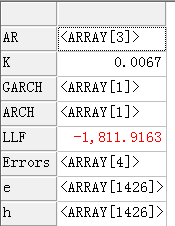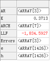 Ret["C"]:均值方程常数项 Ret["AR"]:均值方程AR项 Ret["MA"]:均值方程MA项 Ret["Regress"]:均值方程外生变量回归项 Ret["InMean"]:均值方程条件方差项,当选择模型为“GARCH-M”时存在 Ret["K"]:条件方差方程常数项 Ret["GARCH"]:条件方差方程GARCH项 Ret["ARCH"]:条件方差方程ARCH项 Ret["Leverage"]:条件方差方程杠杆项,当选择模型为“GJR”或者“EGARCH”时存在 Ret["LLF"]:残差的极大似然函数值 Ret["e"]:残差序列 Ret["h"]:条件方差序列 |