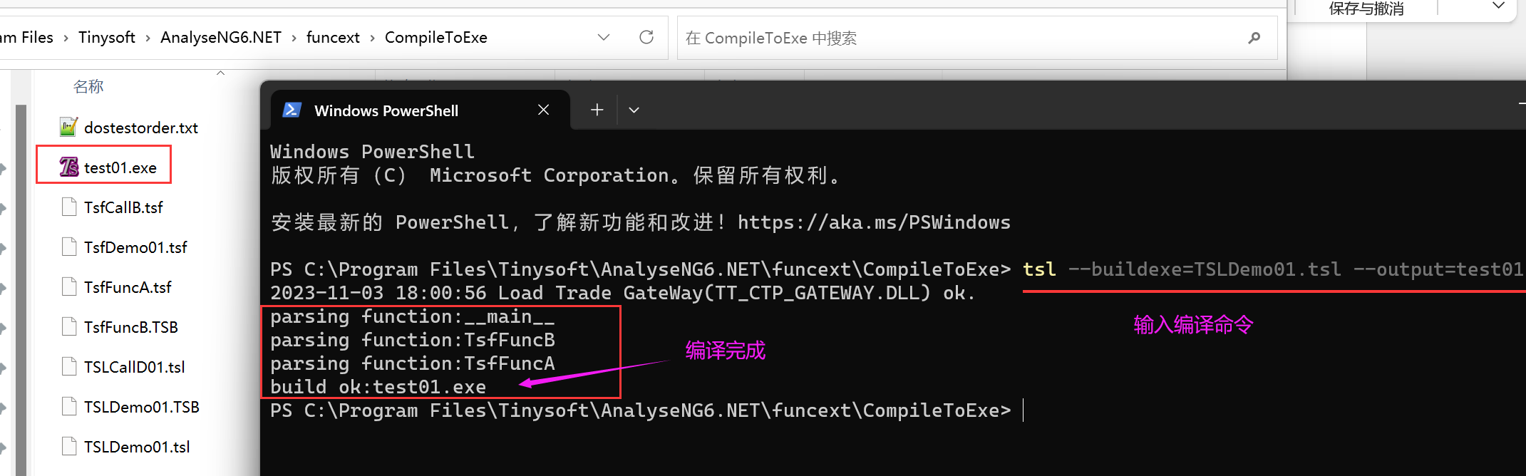 如,将TSLDemo01.tsl程序编译成可执行文件,操作如下: