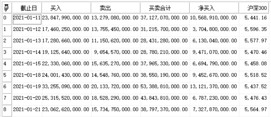 Return Block_HSGCapitalFlowAndMarket("HG000001","SH000300",20210110T,20210121T);