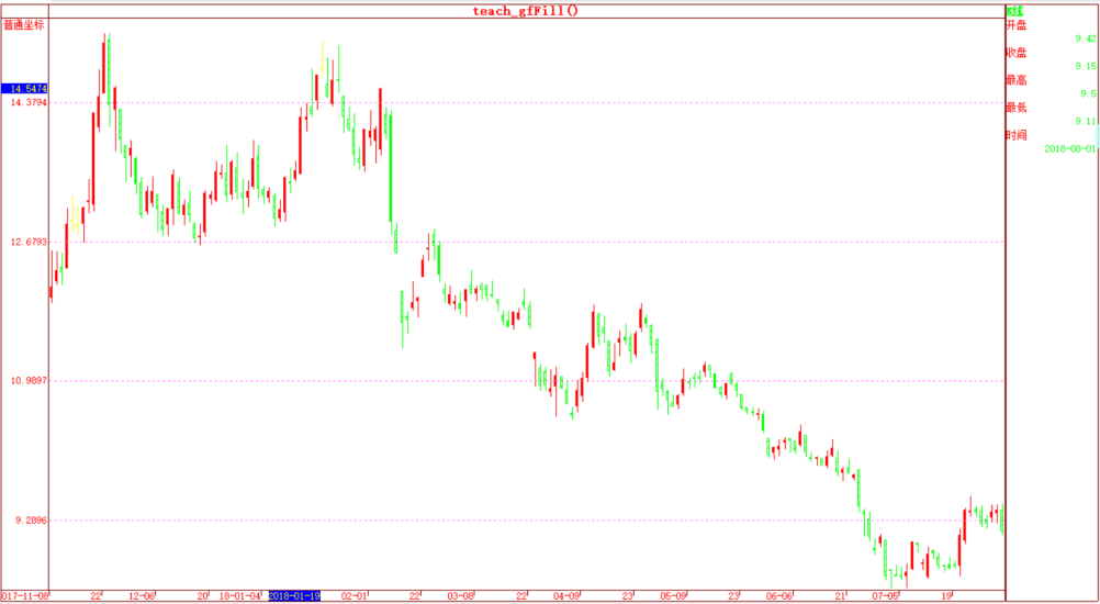 gfFill()教学函数。返回指定股票在指定日开盘价、收盘价、最高价、最低价、交易时间图形,依据涨平跌来选择填充方式,与系统参数(股票,周期,时间,复权)相关。