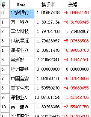 TSL基本函数教学函数。获得板块‘深圳A股’股票序列中各股票在Begt至EndT的换手率与涨幅。