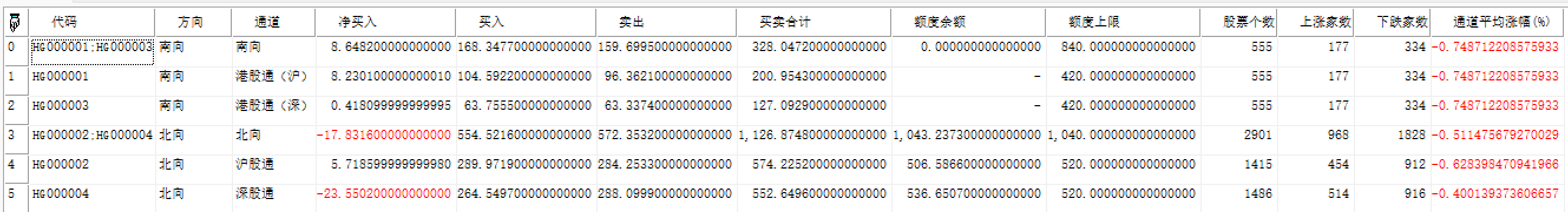 报表,返回指定日所有沪深港通板块的买入、卖出及净买入金额等资金流向数据。港股通(沪)、沪股通板块数据开始日为2014-11-17,港股通(深)、深股通板块数据开始日为2016-12-05。