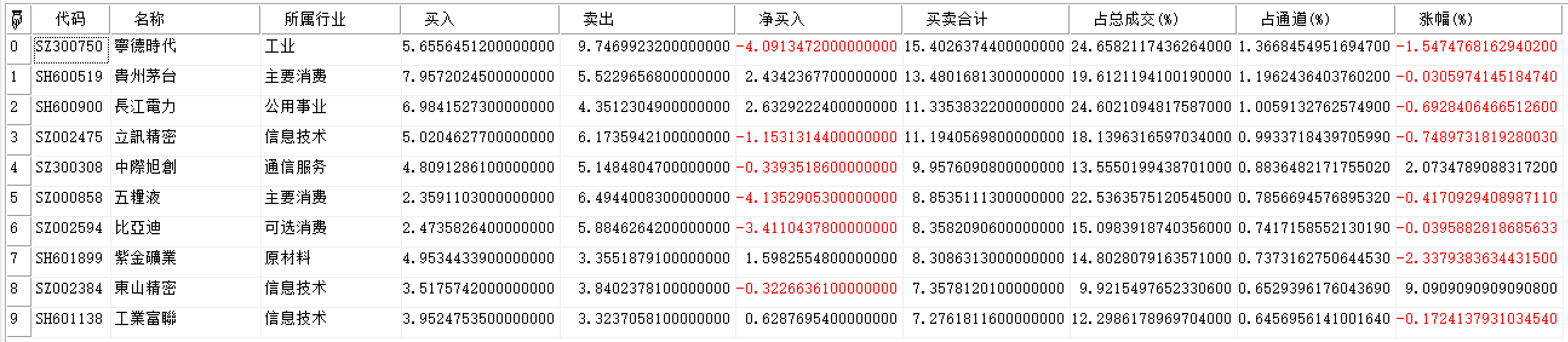 //返回截止至2024-07-10日陆股通板块中证一级行业最新10大成交