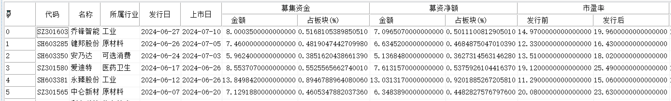 | 返回 | Array | 数组,从开始日期到截止日期指定板块中所有股票的发行上市明细。 |