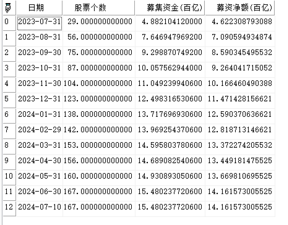 //返回2023-07-10至2024-07-10日全市场的汇总股票个数、募集资金、募资净额