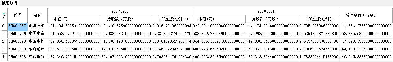 | 返回 | Array | 数组。指定报告期所有基金增持股票。 |