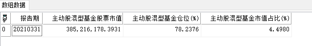 Fund_MT_AAllocaton(Rdate:Integer):Array功能:获取主动股混型基金池A股配置指标:股票市值(万);股票仓位(%);市值占比(%)