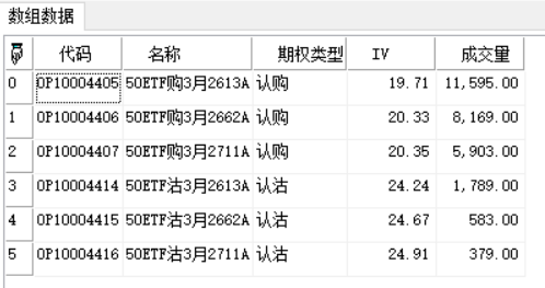 代码、期权类型、IV、成交量 | |