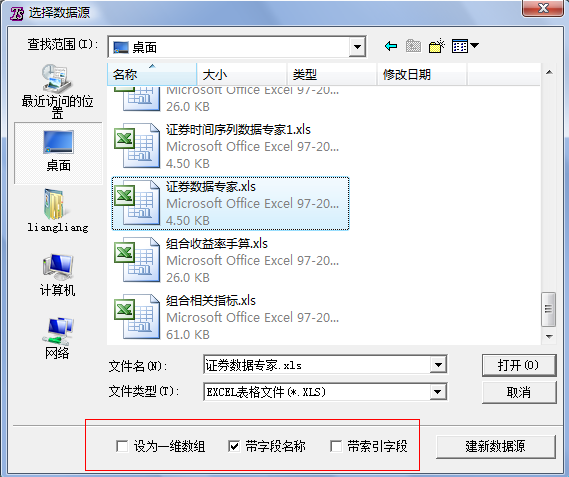 在弹出的“选择数据源”对话框中,选择要添加的数据(需注意文件类型)。选中文件后,该对话框的下方出现三种选择:“设为一维数组”、“带字段名称”、“带索引字段”。(如图3所示)
