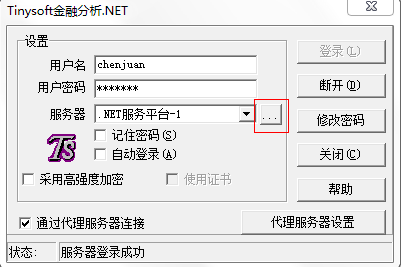 按钮;在弹出的“服务器管理”窗口中,双击你登陆的服务器名,如此处双击“.NET服务平台-1|.NET SERVER-1”,下方显示地址:tsl.tinysoft.com.cn,端口:443,此表名链接的是天软的服务器。