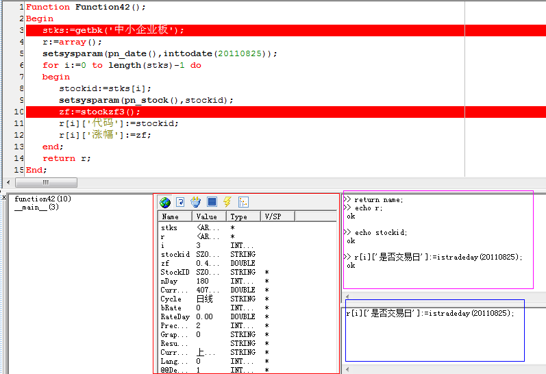 如下面范例中的断点调试,如果执行到语句 stks:=getbk('中小企业板'); ,不会打开setsysparam函数,是因为该函数是系统函数,里面的语句都是底层被封装了的语句,不显示出来。当光标执行到setsysparam(pn_date(),inttodate(20110825));或者zf:=stockzf3();时,将进入被调用的函数 inttodate或者stockzf3。而stockzf3函数中调用的子函数,也将跟踪下去。
