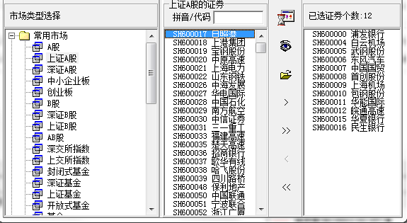 待选证券列表:选择大类后,中间的待选证券列表中展开所有属于该大类下的证券