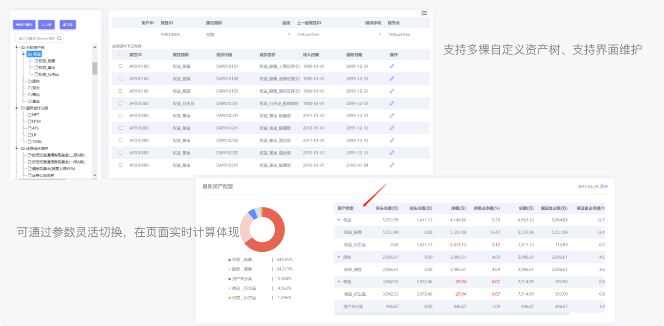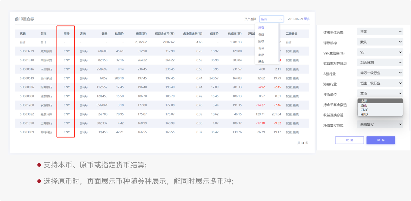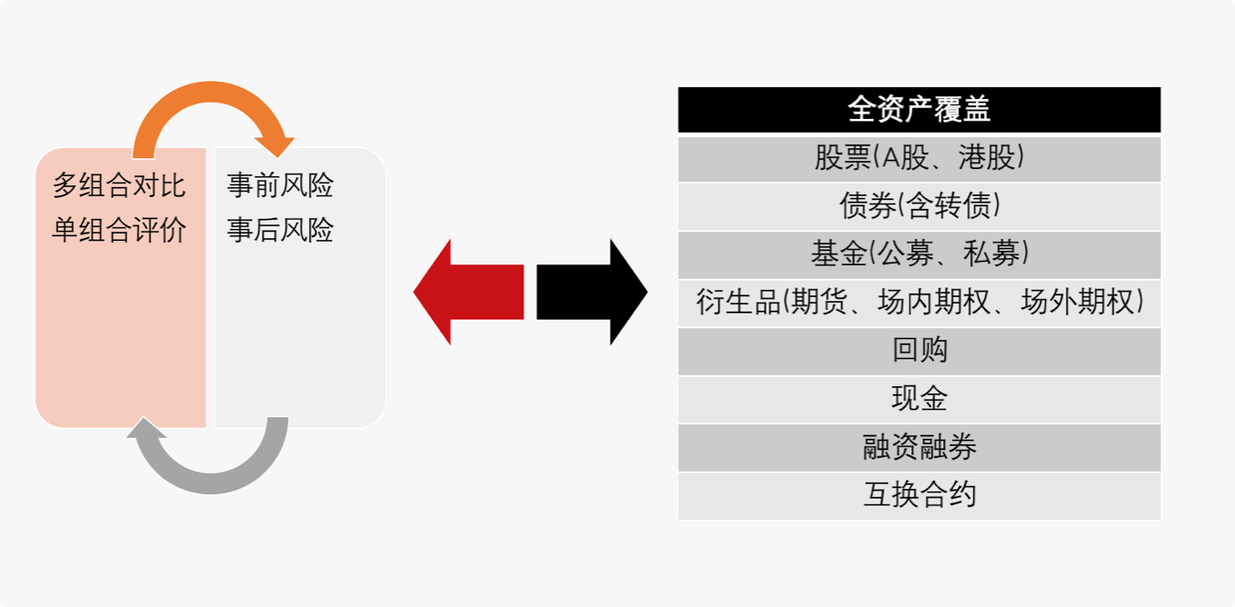覆盖A股、港股、债券(含转债)、期货、期权、基金(公募、私募)、回购、现金、融资融券;