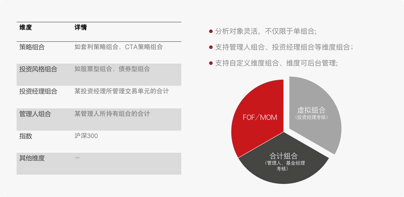包含公募基金(股票型、债券型等)、专户产品(一对一、一对多)、养老基金(企业年金、职业年金、社保产品等),管理人组合、投资经理组合等